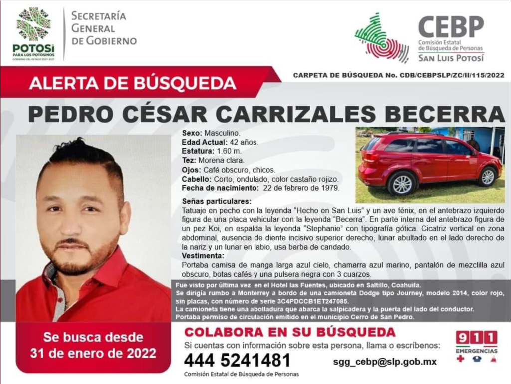La Comisión Estatal de Búsqueda de Personas del estado de San Luis Potosí asegura que la última vez que se vio a Pedro César Carrizales fue cuando se dirigía a Monterrey en una camioneta Dodge color rojo.